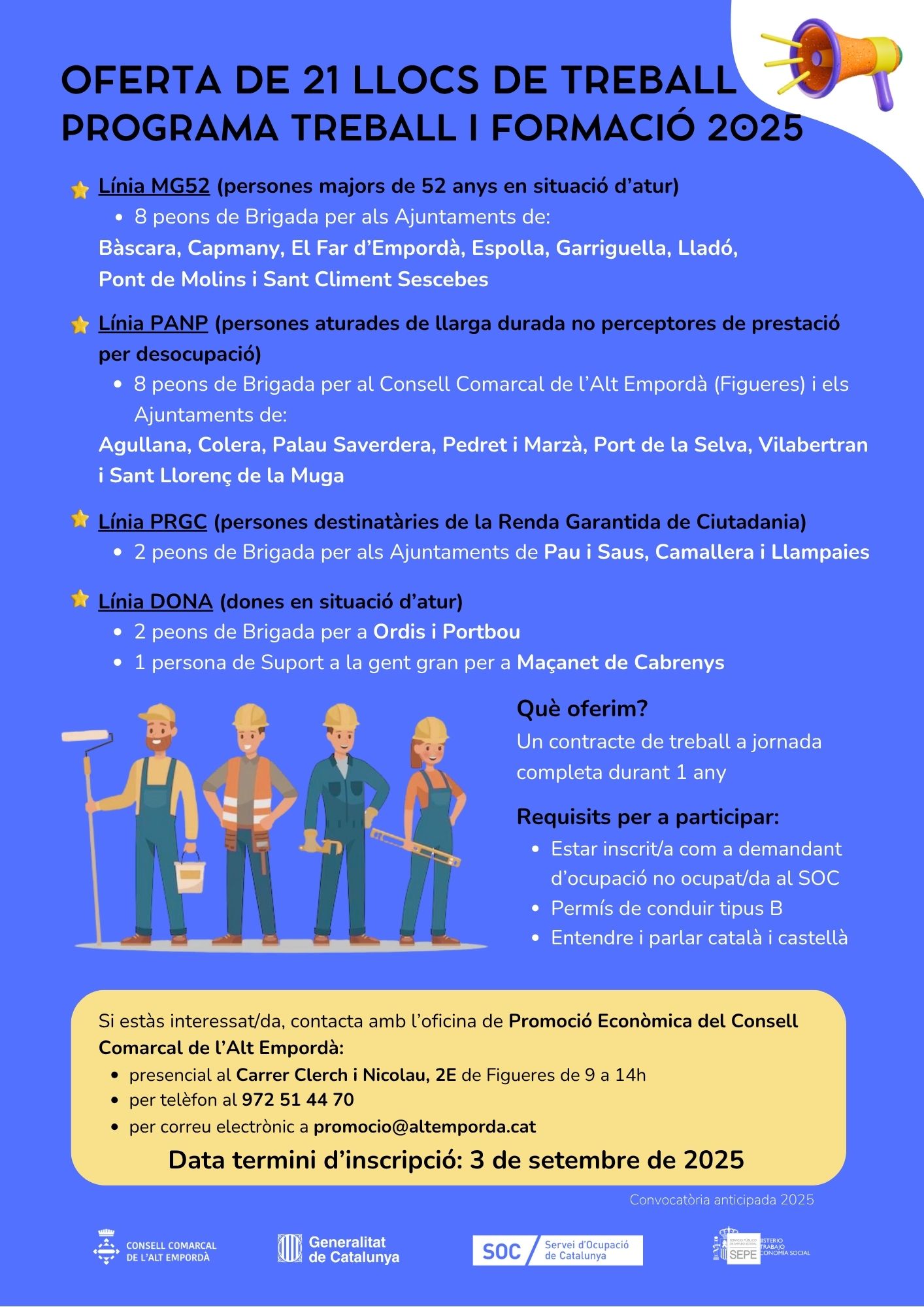 28/07/2025A aquesta notícia podràs trobar tota la informació relacionada amb l’oferta de 21 llocs de treball Programa Treball i Formació 2025.